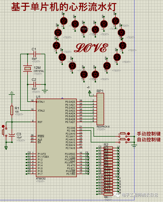 (4)LED排灯模块。心形排列,用以实现多种花样电路;