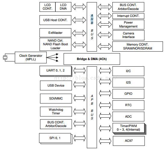 MPLL锁相环产生时钟,供给AMBA总线上的各个设备使用。AHB总线上,主要包括LCD控制器、LCD的DMA模块,USB Host控制器,ExtMaster(允许外部设备作为总线的Master),NAND 控制器、NAND Flash启动的装载器,总线控制器、仲裁器和译码器,中断控制器,电源管理模块,摄像头接口模块,内存控制器(包括SRAM、NOR Flash和SDRAM三种)。