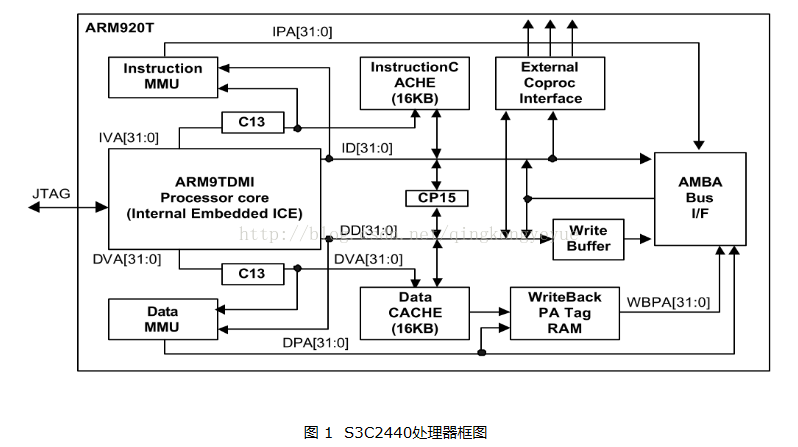 S3C2440处理器的结构如下图所示,其核心单元为ARM9TDMI处理器核,主要包括16K的指令Cache和16K的数据Cache,以及分开的指令和数据MMU单元等。CP15为一个协处理器(Co-Processor)。通过AMBA2.0(Advanced Microcontroller Bus Architecture)总线接口与外部设备相连。