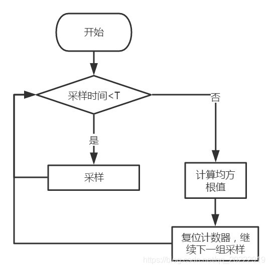 程序开始采样后,计时器开始计时,当计时时间小于T,就继续采样。当计时时间大于T时,结束采样。然后将采样值取平方,再求累加和,然后再将累加和进行开方运算。所求的值就是在采样T时间内电流波形的均方根值,也就是有效值。这个有效值值就可以用来计算当前电源输入电流值的有效值。