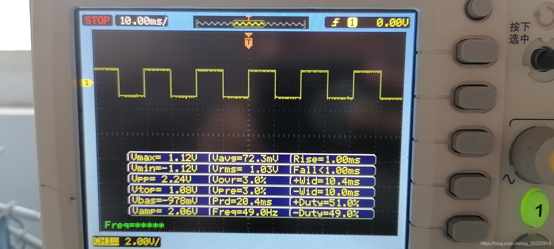 通过示波器观测可以看到 +wid=10.4ms -wid=10ms 说明LED高电平时长为10.4ms,低电平时长为10ms。通过LED电平可以间接的看出,采样一次数据MCU所耗费的时间为10ms左右。