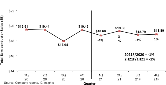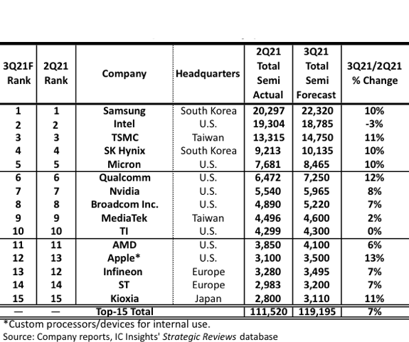 总结来说,可预期前15名的半导体供应商在2021年第三季销量成长7%。半导体销售在2021年底前仍维持强劲,IC Insights预期今年全球半导体销售将成长24%。