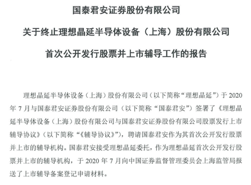 9月17日,国泰君安证券发布关于终止理想晶延半导体设备(上海)股份有限公司首次公开发行股票并上市辅导工作的报告。