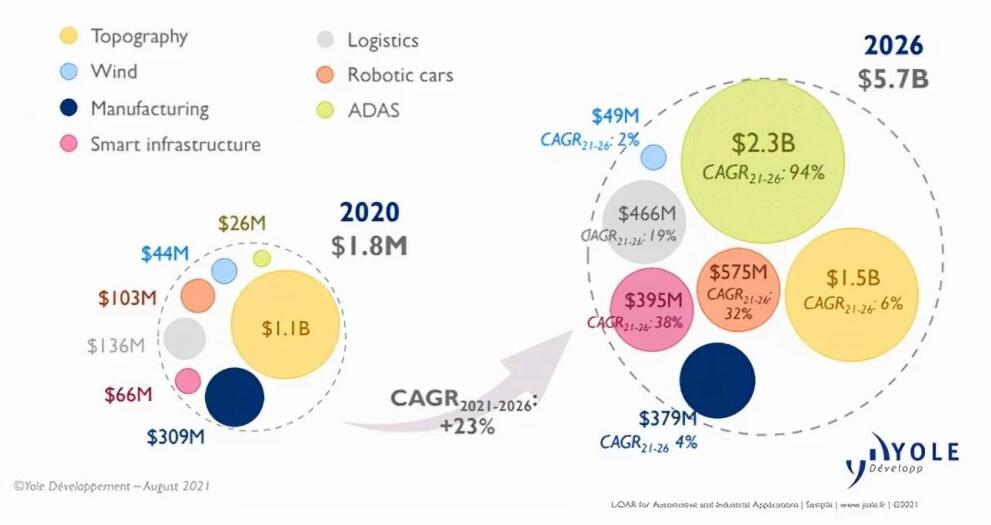 据Yole预测,到2026年激光雷达市场规模将达到57亿美元,2020-2026年,年复合增长率将达到21%,细分市场里,智慧城市增速最快将达到35%;自动驾驶出租车和巴士增速为33%;智能物流为23%。