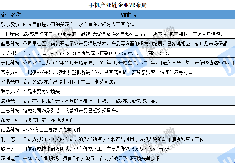 据不完全统计,除上文提到的歌尔股份之外,立讯精密、TCL科技、长信科技、京东方A等多家手机产业链企业已在VR领域有所布局,部分产品已能量产出货。
