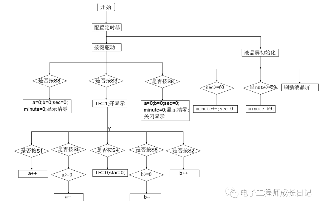 当比赛开始时,先判断是哪队得分,每次加分加1分。如果不小心加错分了,则按键减去多加的分。当比赛开始时,首先按下开始按钮S1显示开始工作,加分和误操作,暂停等按钮可工作。设计程序流程图如图。