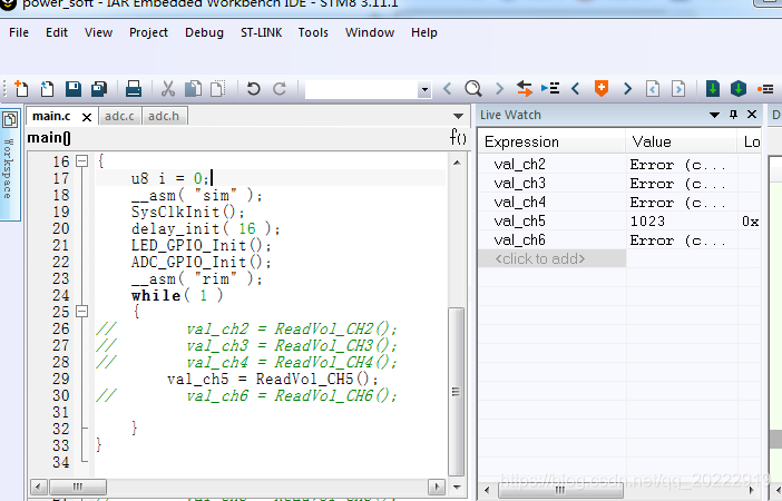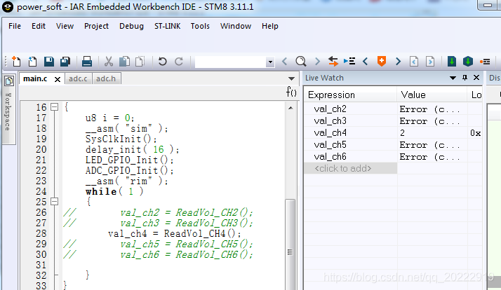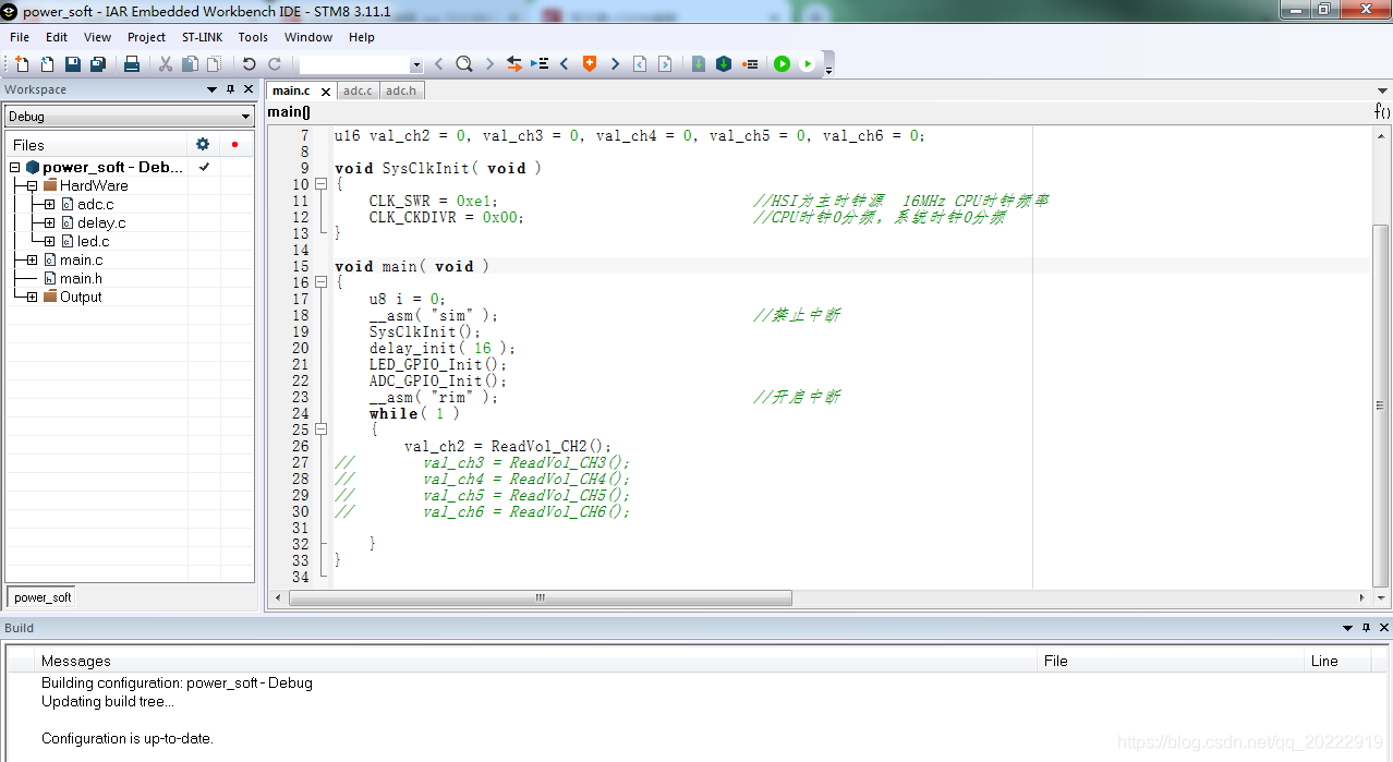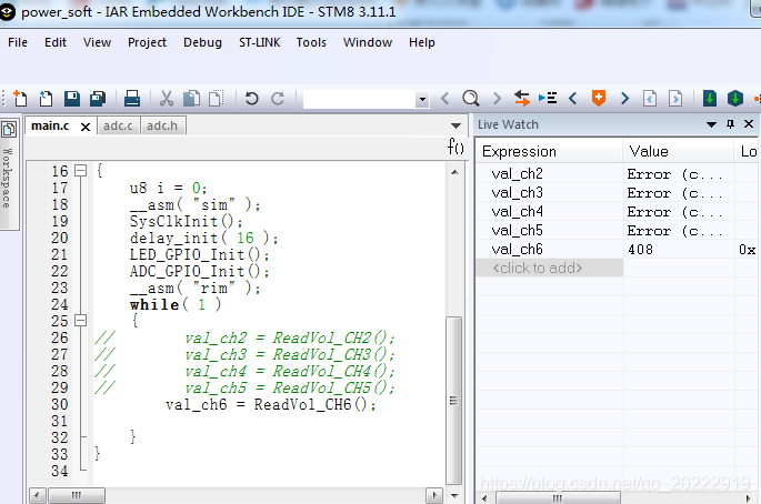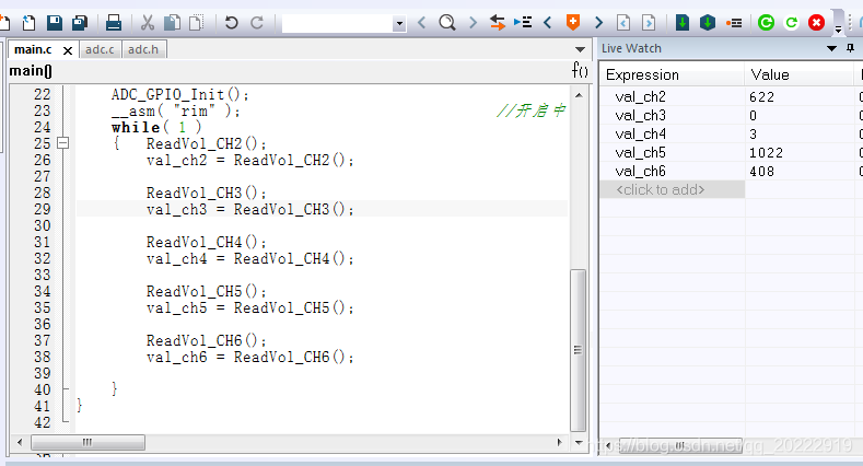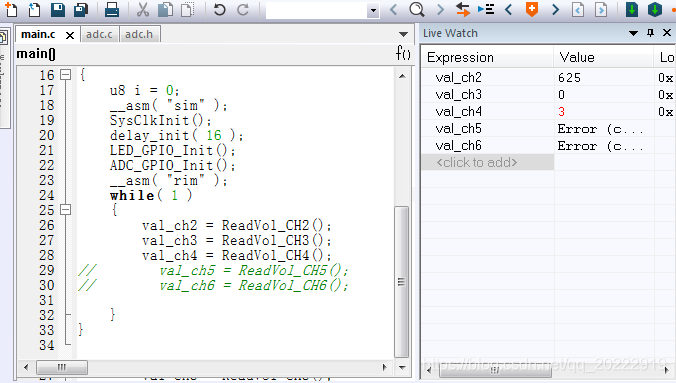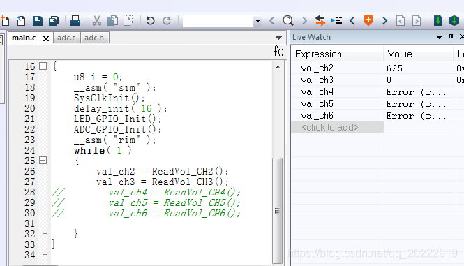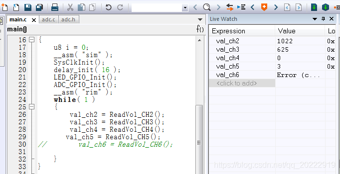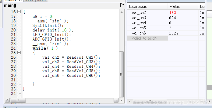 这是STM8S003单片机5个通道ADC采样程序,在主函数中依次读取各个通道的ADC采样值。首先单独测试一下每个通道的值。
