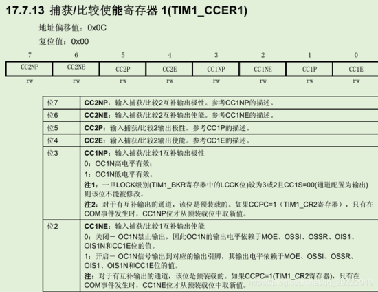 TIM1_CCER1 |= (1<<0)|(1<<2); //CC1为输出 OC1高电平有效 开启OC1N OC1N高电平有效