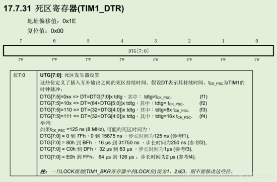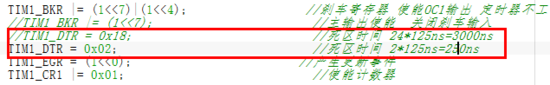 TIM1_DTR = 0x18; //死区时间 24*125ns=3000ns