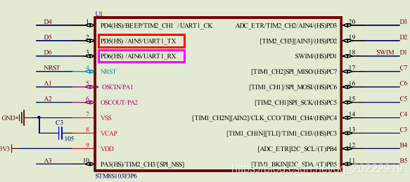 通过芯片管脚的原理图可以看到PD5口可以当作模拟采样第5通道使用,也可以用当做串口发送口使用。PD6口可以当做模拟采样第6通道使用,也可以当做串口接收口使用。