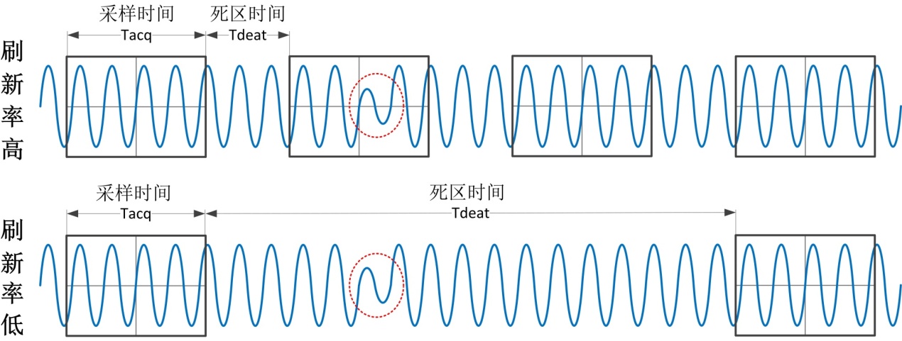 波形刷新率,也称为波形捕获率,指在1秒钟之内,示波器捕捉的波形次数。如下所示是死区时间与波形刷新率的关系。