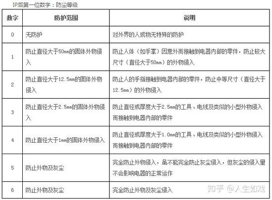 IP防护等级是指产品防尘防水的能力,IP防护等级是由两个数字所组成,第1个数字表示电器防尘、防止外物侵入的等级,这里所指的外物含工具,人的手指等均不可接触到电器内之带电部分,以免触电。第2个数字表示电器防湿气、防水侵入的密闭程度。如下表所示: