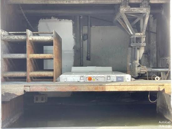 由一侧对电池施加 200kN 的压力,这相当于两辆大巴车的重量(国标为100kN)。整个测试过程持续施压 10 分钟,在电池无冒烟或者着火之后才可通过。
