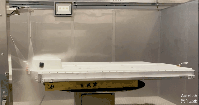 采用不同角度的高压水或者盐雾柱对电池包进行冲击,来检验电池的防水密封性和耐腐蚀能力。整个测试大约1分钟,看起来并没有对电池产生什么破坏。