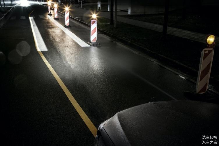 场景2:比如前方正在施工或者道路较窄,数字大灯可以投射引导线:投射代表汽车宽度的两条光迹,在前方指引,帮助你确定方向的同时,可以探测能否通过狭窄的道路。