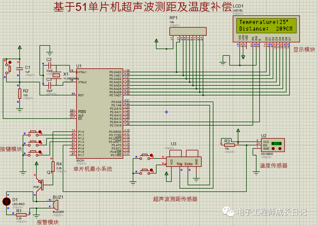 系统由STC89C52单片机+超声波测距传感器(HC-SR04)+DS18B20温度传感器+LCD1602液晶显示屏+按键+蜂鸣器+电源构成