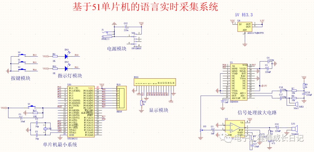 系统由STC89C52单片机+ISD4004录音芯片+LM386功放模块+小喇叭+LCD1602+按键+指示灯+电源构成。