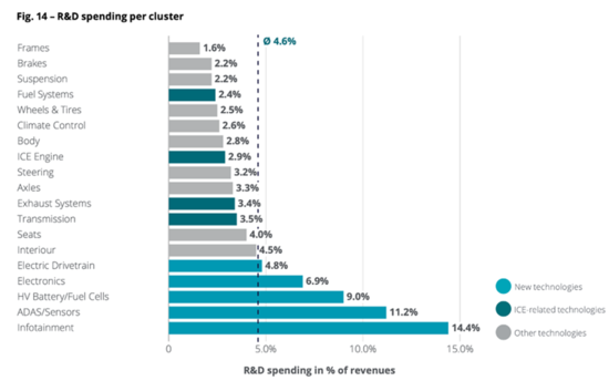 汽车电子及电动相关技术的研发支出超过了车辆其它投入的总和