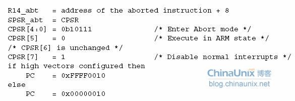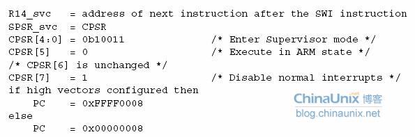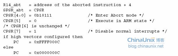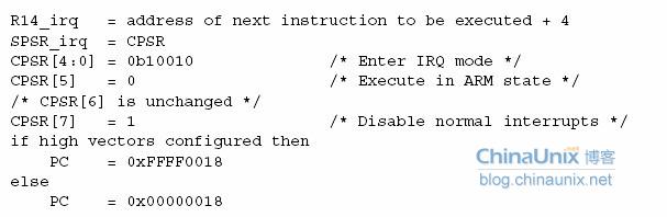 首先说明CPU会自动完成的部分,用ARM结构手册中的代码描述如下:
