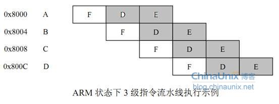 R14_ SPSR_< exception_mode > = CPSR CPSR[4:0] = exception mode number //设置工作模式 CPSR[5] = 0 ; //ARM指令 If CPSR[6] = 1 ; CPSR[7] = 1 ; //任何异常模式下都会关闭IRQ中断 PC = exception vector address 从上面的代码中我们可以发现CPU自动处理的过程包括如下: 1、拷贝CPSR到SPSR_ 2、设置适当的CPSR位:改变处理器状态进入ARM状态;改变处理器模式进入相应的异常模式;设置中断禁止位禁止相应中断。 3、更新LR_ 4、设置PC到相应的异常向量 以上的操作都是CPU自动完成,异常的向量表如下: 返回地址问题 异常的返回地址也是需要我们注意的地方,不同的异常模式返回地址也是存在差异的,这主要是因为各种异常产生的机理存在差别所导致的。这样我们的需要在异常进入处理函数之前或者在返回时调整返回地址,一般采用进入异常处理函数前进行手动调整。下面每一种异常R14保存的值都给了出来,其中也包含了CPU自动处理的部分,根据保存的R14就可以知道怎样实现地址的返回。 复位异常: 可以看出该模式下的先对来说返回地址也比较简单,不需要做太多的描述。 未定义的指令异常: 返回的方式也比较简单: MOVS PC, R14 预取指令中止异常: 返回需要做下面的调整: SUBS PC, R14, #4 数据中止 返回地址需要做下面的调整: 如果需要重新访问数据则: SUBS PC, R14, #8 如果不需要重新访问数据则: SUBS PC, R14, #4 IRQ中断的处理过程: 返回地址需要做下面的调整: SUBS PC,R14,#4 IFQ中断: 返回地址需要做下面的调整: SUBS PC, R14 ,#4 从上面的代码可以知道,对于每一种异常,保存的返回地址都是不一样的,一般都需要我们手动的跳转,当然调整的时机也需要我们选择,是在进入处理前跳转还是返回时调整都是需要我们程序员控制的。 在ARM Developer Suite Developer Guide中对ARM处理器的异常处理操作提供能更加详细的解释,每一种异常下的处理方式如下文描述: 异常返回时另一个非常重要的问题是返回地址的确定,在前面曾提到进入异常时处理器会有一个保存LR的动作,但是该保存值并不一定是正确的返回地址,下面以一个简单的指令执行流水状态图来对此加以说明。 我们知道在ARM架构里,PC值指向当前执行指令的地址加8处,也就是说,当执行指令A(地址0x8000)时,PC等于指令C的地址(0x8008)。假如指令A是“BL”指令,则当执行该指令时,会把PC(=0x8008)保存到LR寄存器里面,但是接下去处理器会马上对LR进行一个自动的调整动作:LR=LR-0x4。这样,最终保存在 LR里面的是 B指令的地址,所以当从 BL返回时,LR里面正好是正确的返回地址。同样的调整机制在所有LR自动保存操作中都存在,比如进入中断响应时,处理器所做的LR保存中,也进行了一次自动调整,并且调整动作都是LR=LR-0x4。 下面,我们对不同类型的异常的返回地址依次进行说明: 假设在指令A处(地址0x8000)发生了异常,进入异常响应后,LR上经过调整保存的地址值应该是B的地址0x8004。 1、如果发生的是软件中断,即A是“SWI”指令 异常是由指令本身引起的,从 SWI中断返回后下一条执行指令就是B,正好是LR寄存器保存的地址,所以只要直接把LR恢复给PC。 MOVS pc, lr 2、发生的是Undefined instruction异常 异常是由指令本身引起的,从异常返回后下一条执行指令就是B,正好是LR寄存器保存的地址,所以只要直接把LR恢复给PC。 MOVS pc, lr 3、发生的是IRQ或FIQ中断 因为指令不可能被中断打断,所以A指令执行完以后才能响应中断,此时PC已更新,指向指令D的地址(地址0x800C),LR上经过调整保存的地址值是C的地址0x8008。中断返回后应该执行B指令,所以返回操作是: SUBS pc, lr, #4 4、发生的是Prefetch Abort异常 该异常并不是处理器试图从一个非法地址取指令时触发,取出的指令只是被标记为非法,按正常处理流程放在流水线上,在执行阶段触发Prefetch Abort异常,此时LR上经过调整保存的地址值是B的地址0x8004。异常返回应该返回到A指令,尝试重新取指令,所以返回操作是: SUBS pc, lr, #4 5、发生的是“Data Abort” CPU访问存储器时触发该异常,此时PC指向指令D的地址(地址0x800C),LR上经过调整保存的地址值是C的地址0x8008。异常返回后,应回到指令A,尝试重新操作存储器,所以返回操作是: SUBS pc, lr, #8 以上就是ARM异常的CPU操作部分,接下来就是程序员应该完成的操作。 1.由于CPU会自动跳转到对应的异常向量中,因此只需要在在各个异常向量中存放对应的操作,最简单的都是存放一个B指令跳转到对应的异常处理函数的操作即可。但由于B指令的跳转返回只有+-32M,而异常处理函数的地址可能会超过+-32M,因此可以采用另一种方式实现方式:在异常向量中保存一条指令LDR PC [addr],其中的addr中就保存了异常处理函数的地址,当然addr的相对地址要小于+-32M。这样也就解决了跳转范围的问题。 2.接下来就是异常处理函数对应的操作,可以在进入异常处理之前就进行返回地址的调整,这样后面就不用进行处理啦,当然也可以在返回过程中再调整。一般都是在这个过程中进行调整。进行压栈操作,保存对应的环境变量。调用实际的处理过程等。 3.出栈,恢复CPU的状态和寄存器的值。由于第一步中已经调整好返回地址,这一步不需要再次调整。当然如果之前没有调整,这里则需要进行相应的调整。 在uC/OS-II的官网移植中采用通用异常处理函数的方式实现异常的处理,下面我们来分析其中的部分代码: 首先是处理器部分的移植,包括异常向量、异常的ID号,存储异常处理函