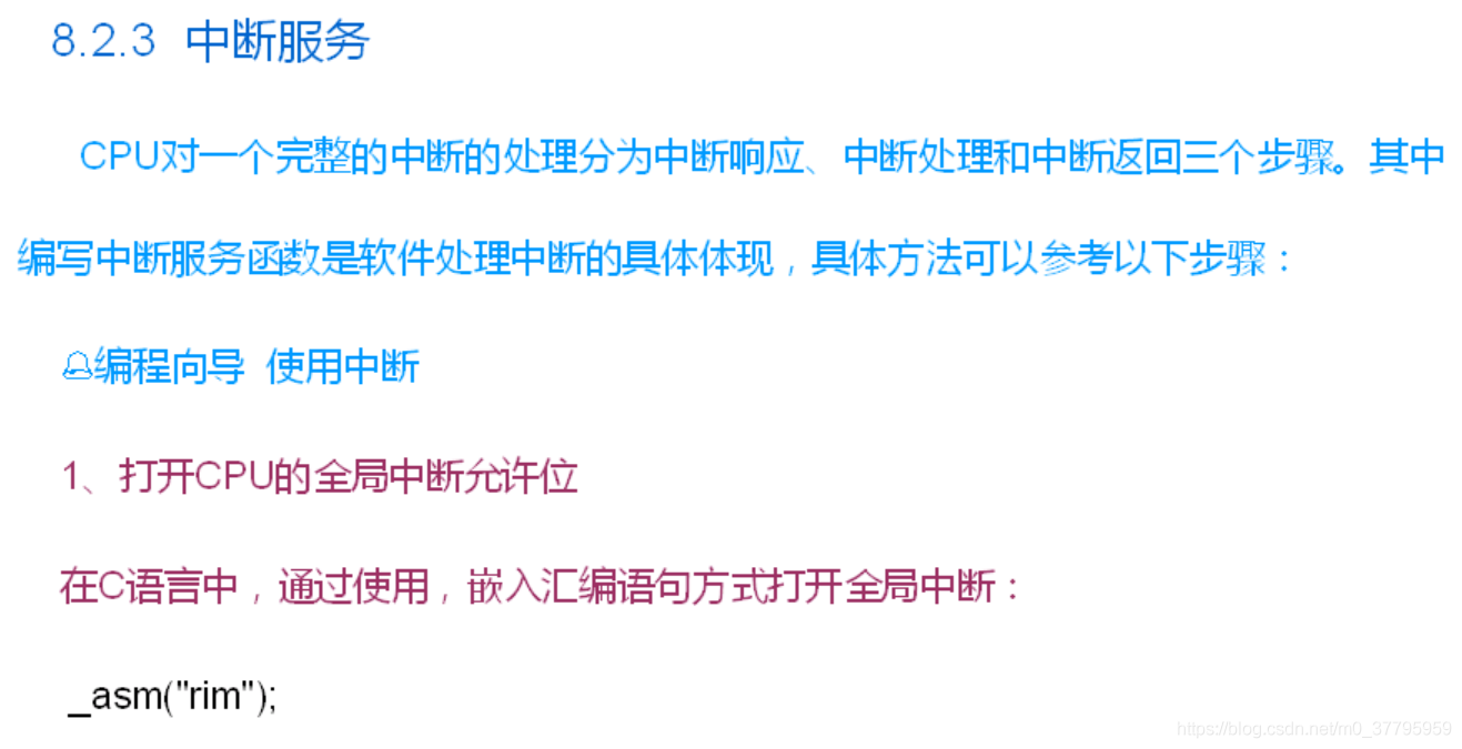 REST : 此中断时软件和硬件最高级的中断,此中断响应时,其他所有的中断将会被禁止掉,如果想要在开启这个中断必须要执行“RIM”指令来操作。