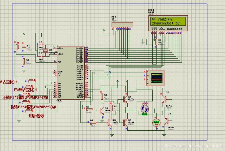 (2)LCD1602液晶显示当前的转速(转速单位为转/分)和显示当前的pwm占空比0~100%;