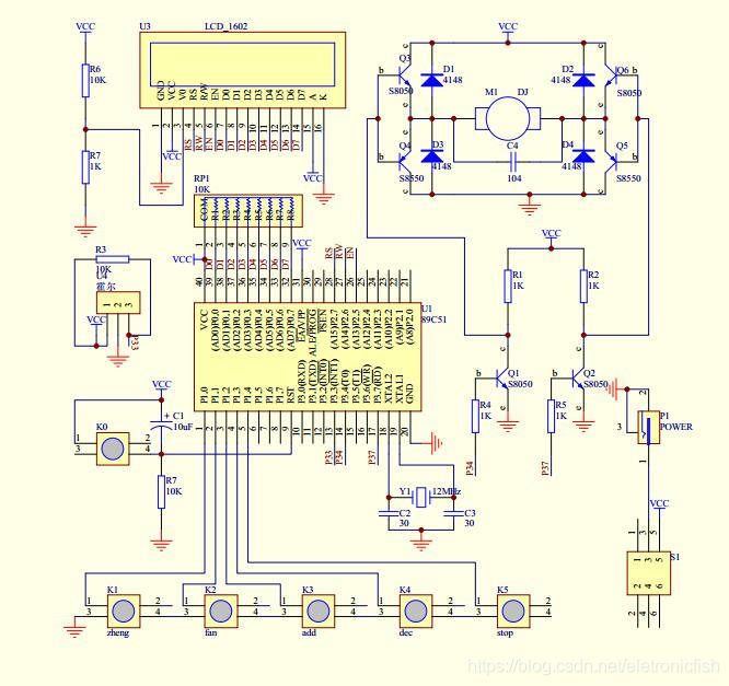 硬件主要由51单片机+最小系统+LCD1602液晶显示模块+霍尔测速模块+电机模块+按键模块构成;