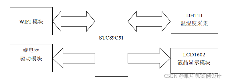 主要由51单片机+最小系统+LCD1602液晶显示模块+温湿度采集模块+继电器驱动模块+风扇模块+LED指示灯模块+按键模块+AT24C02存储模块+蜂鸣器报警模块;如图: