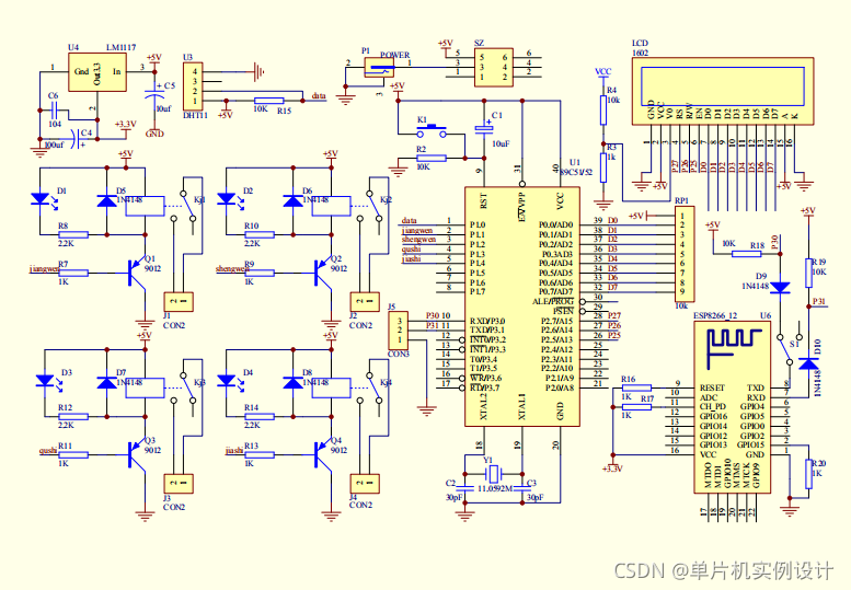 (3)LCD1602液晶显示,上面行显示当前的温度和湿度,下面行显示相应的冷、热、干、湿。