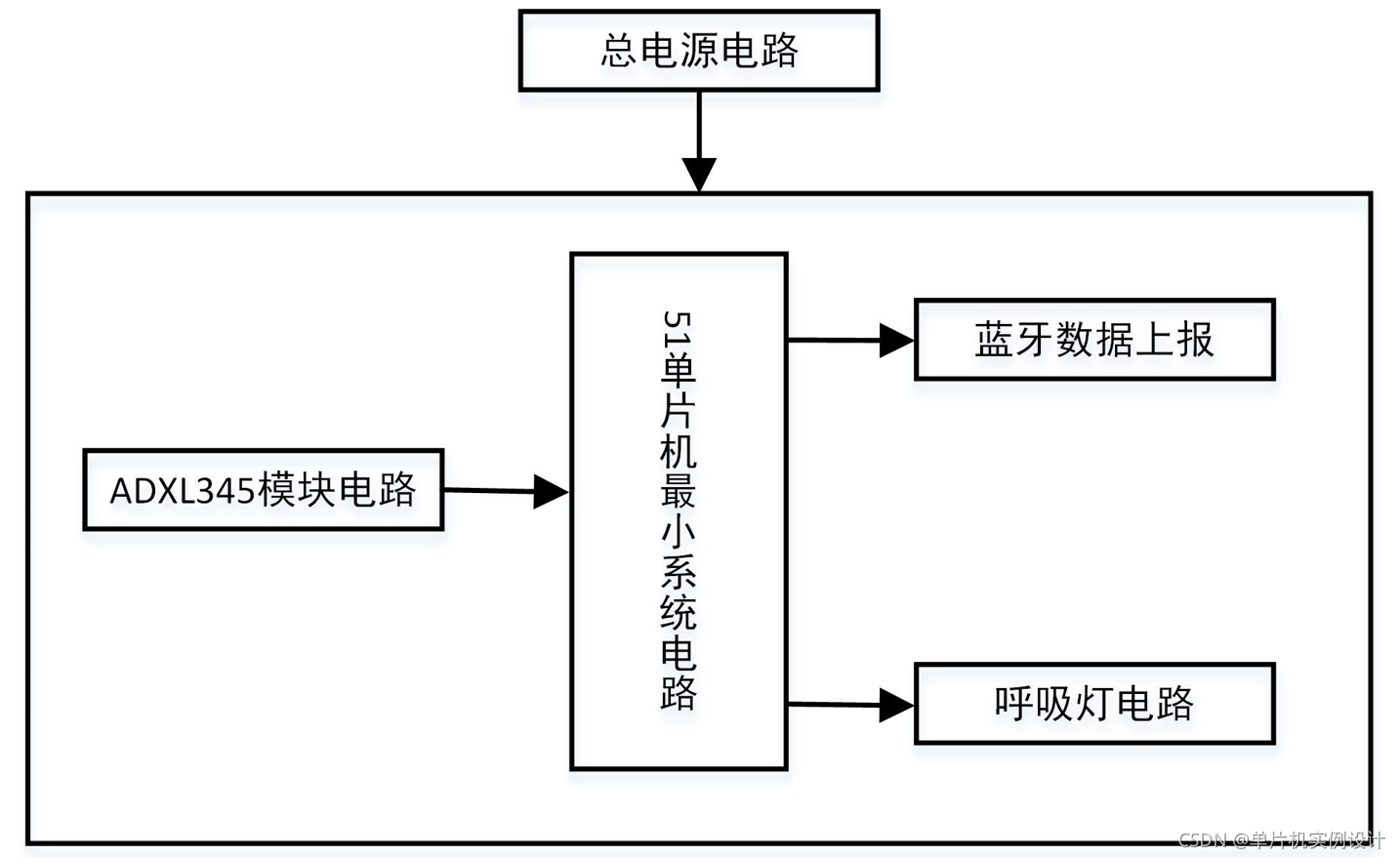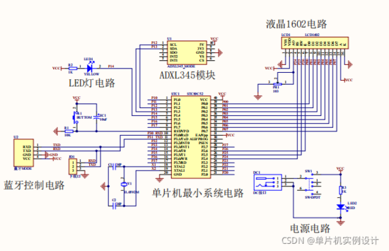 主要由51单片机最小系统+ADXL345加速度传感器+lcd1602液晶电路+蓝牙模块电路+呼吸灯电路+电源电路组成;如图: