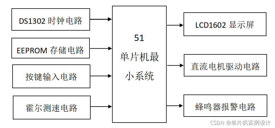 本设计的硬件主要由51单片机+最小系统+LCD1602液晶显示模块+霍尔测速模块+电机模块+电位器调速模块+蜂鸣器模块+LED指示灯模块+按键模块+时钟模块+AT24C02存储芯片: