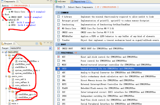 5、系统将弹出 Repository,这里可直接选择程序需要的库,勾选GPIO,系统将自动勾选RCC、CMSIS BOOT、M0 Cmsis Core等,并直接生成对应