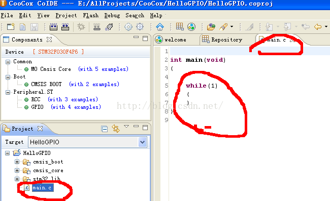 2、运行CoIDE,点击菜单栏的Project——New Project,填写项目名称HelloGPIO