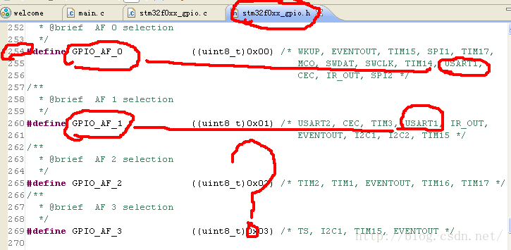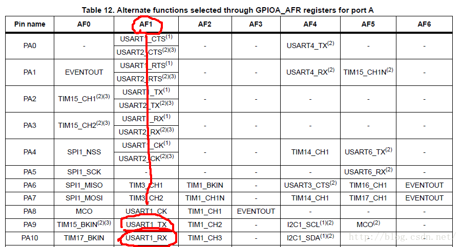 GPIO_PinAFConfig(GPIOA,GPIO_PinSource9,GPIO_AF_1);//为什么是AF1,而不是AF0呢?见下图,数据手册才是准确的