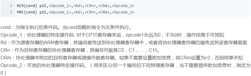 5) MRC,协处理器寄存器到ARM寄存器的数据传送指令,