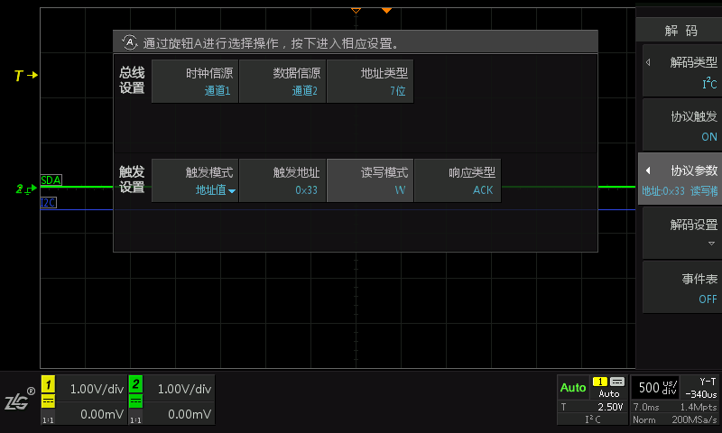 使用ZDS2022示波器测试IIC数据(被测IIC信号中包含0x33地址位,如图2.6所示)时,设置触发为IIC模式触发,设置地址位触发,地址位为0x33,写模式,ACK响应。但设置之后却无法对数据进行触发,如图2.7所示。 从图中来看,应该是触发设置不正确导致不触发。图中有四个地方设置错误:
