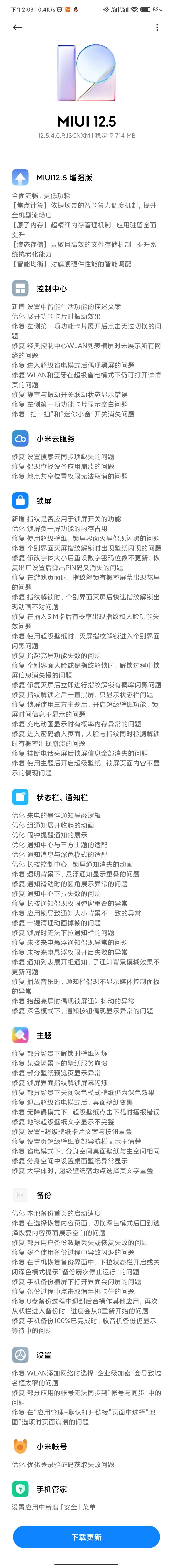 本次系统更新的版本号为 MIUI 12.5.4.0RJSCNXM,带来了焦点计算、原子内存、液态存储、智能均衡四大更新,全面提高手机流畅度。此外,新增了多项功能,优化了通知栏、锁屏、小米账号等功能,并修复了众多 Bug。以下为详细内容: