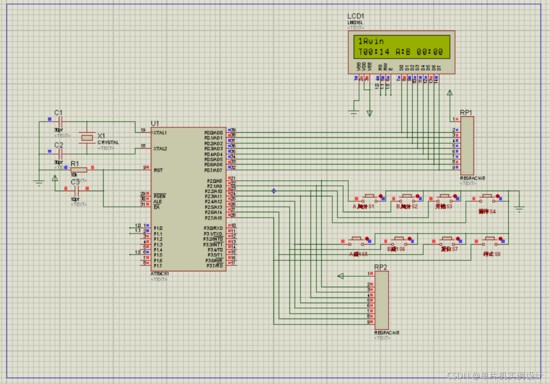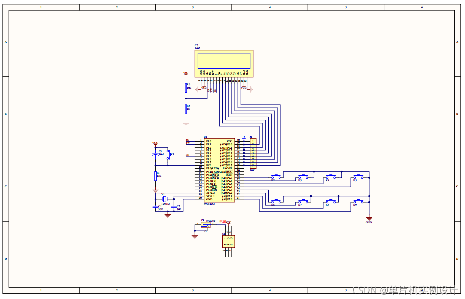 主要由51单片机+最小系统+LCD1602液晶显示模块+LED指示灯模块+按键模块;如图:
