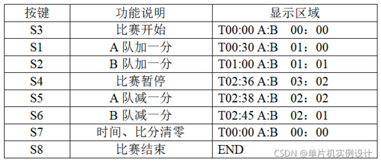 (1)采用按钮开关实现功能控制,按照设计的功能模块共选用8个按钮开关,分别实现启动、A队加分、A队减分、B队加分、B队减分、暂停、停止、清零功能。