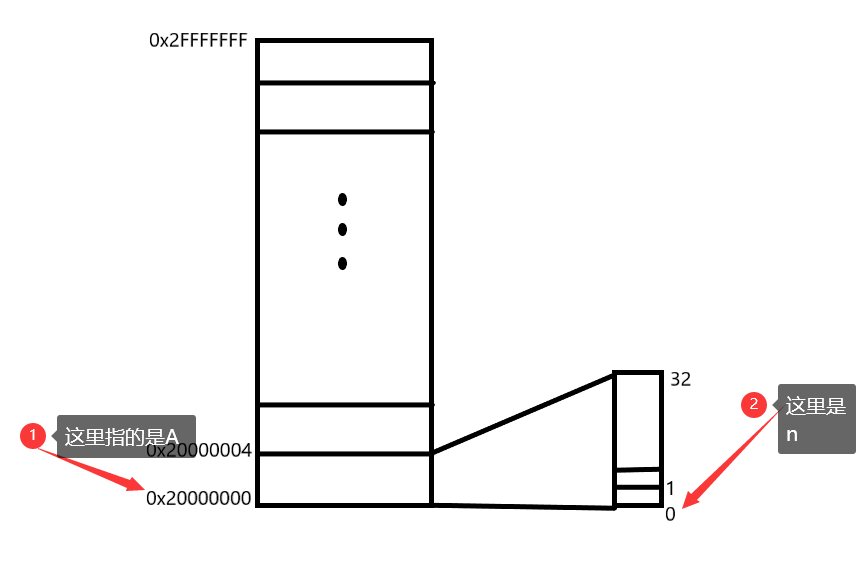 首先我们需要注意的一点是,A是SRAM位带区的某个比特的字节地址,注意是字节地址,我们都知道STM32中每个寄存器是32位的,所以每个寄存器站用4个字节,而0x20000000是总线地址,也就是基地址,寄存器地址是在这个基地址的基础上偏移的。如下图: