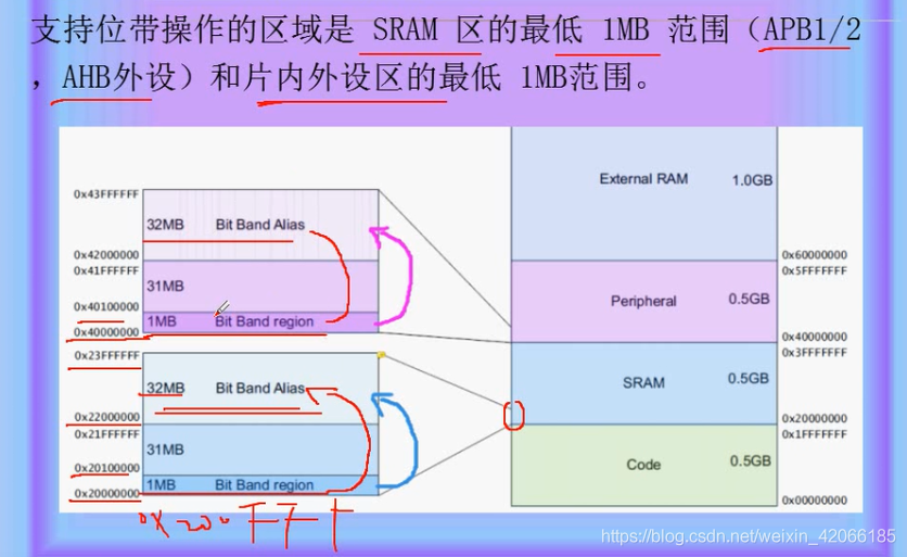 什么是位带呢? stm32 中没有sbit, 所以我们采用的是位带别名区