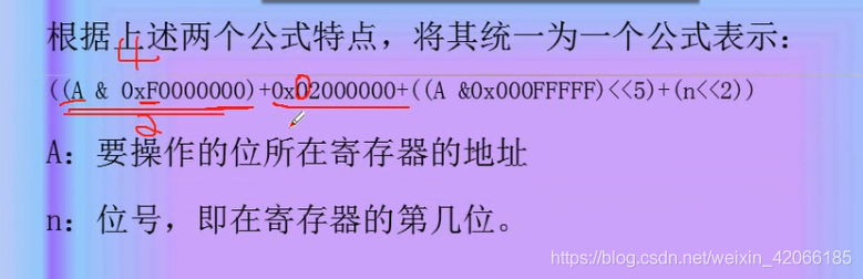别名区地址=外设微带别名区的基地址+(位带区-位带区的起始地址)*32+n*4
