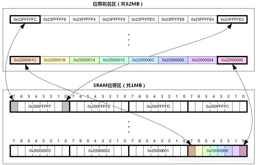 z 位带别名: 对别名地址的访问最终作用到位带区的访问上(注意:这中途有一个对
