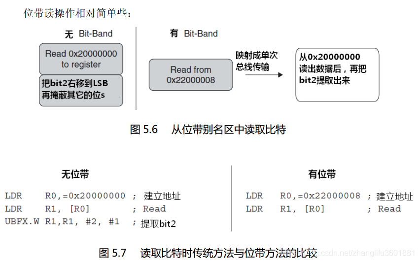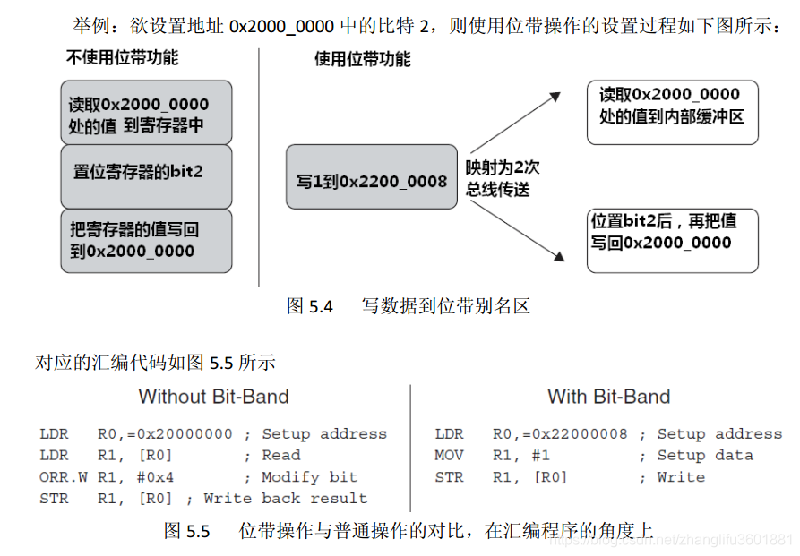 在《ARM Cortex-M3权为指南》中的第87页对位带操作如下描述: