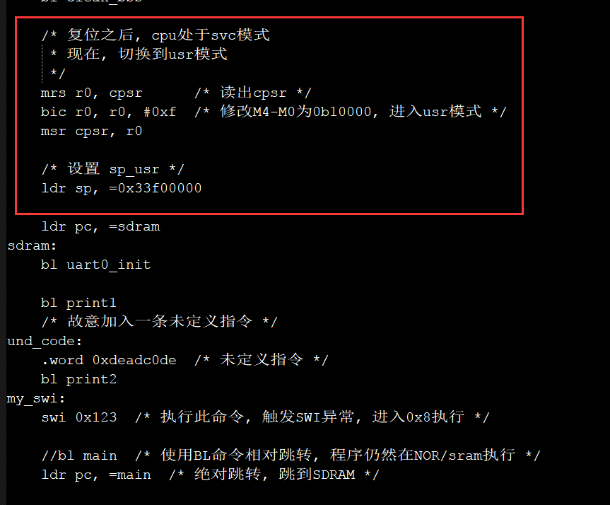 由于切换了模式,需要重新设置栈,因为我们要调用c函数,而栈我们是在sdram的最高地址往下开辟的。