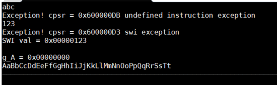 这样,当代码运行到swi 0x123是,就会出现我们软中断异常处理,打印消息如下: