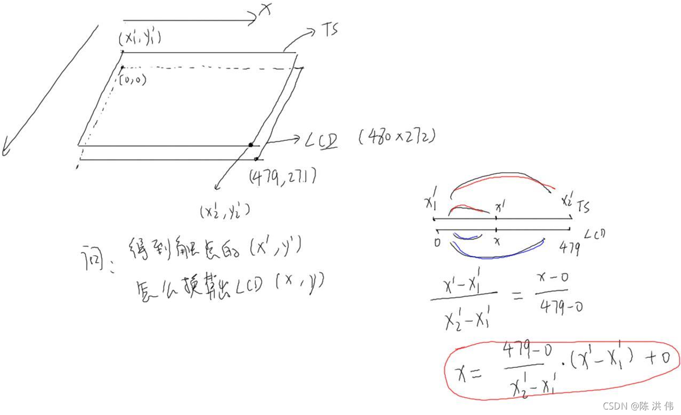 所谓校准就是找到一个公式把电压值转换为坐标值,我们的触摸屏覆盖在LCD上面,当我们得到出点的电压值之后可以通过比例公式得到LCD的坐标。