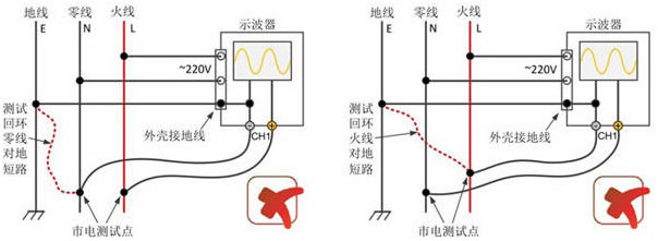 应用高压差分探头测量市电,火线和零线测试点正反接都没关系,探头内部通过高阻的方式将测量端的地和示波器的地隔离开来,不会造成短路问题,测量方式如图5右所示。