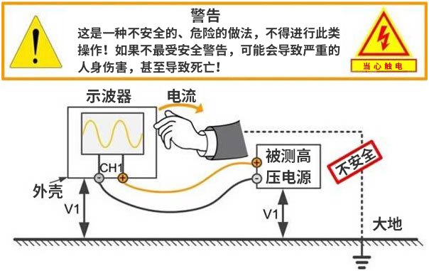 浮地测量时,示波器外壳金属端和探头接地端带有同等电平。当测量市电时,外壳可能带有220V的电压,人体一旦接触到示波器外壳,电流会经过人体流入大地,非常危险!