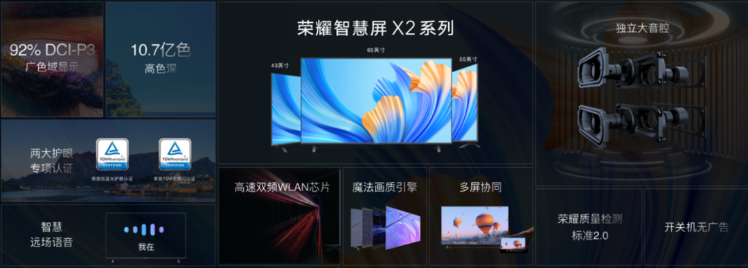 本次发布的荣耀智慧屏X2也严格践行了这一点。屏幕素质是大屏产品的基本功,荣耀智慧屏X2采用了一块10.7亿色广色域全彩屏,色彩显示绚丽丰富,远超同价位产品。但荣耀并未满足于此,而是积极下放了魔法画质引擎,用HDR高动态范围解码、HSY智能精准调色等技术不断拉高画面表现力。